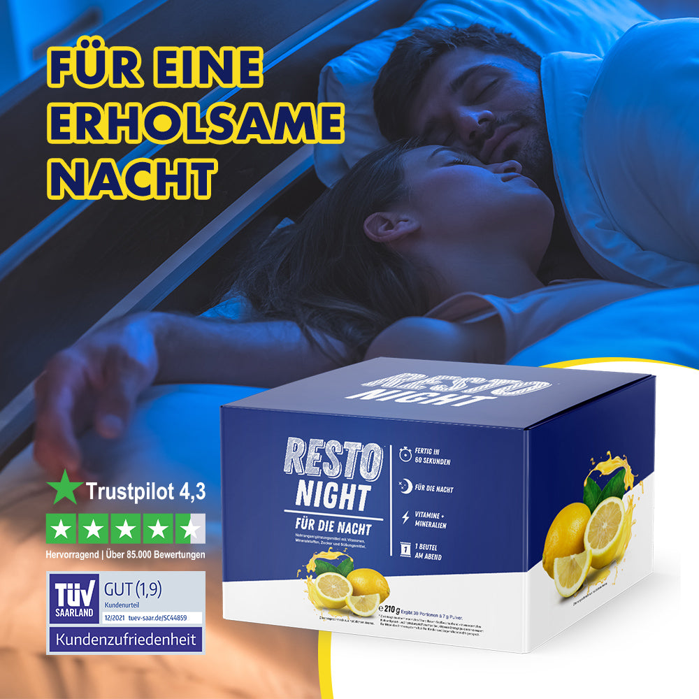 Resto Night ist mit seinem Mix aus Vitaminen und Mineralien der ideale Gute Nacht Drink für Dich. Am Abend eingenommen kann er die Erholung und regenerative Prozesse, die im Körper zu dieser Zeit und auch in der Nacht ablaufen unterstützen und dir so einen erholsamen Schlaf bescheren.